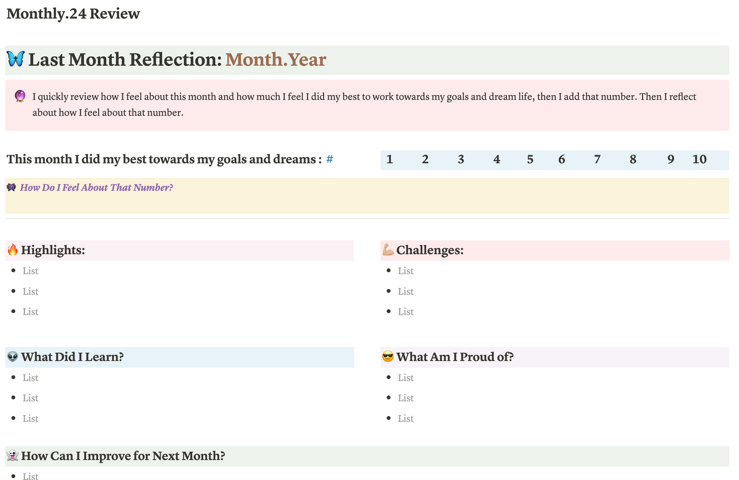 You'll plan your months, break down your goals into a week by week basis and also review and reflect on each month as it ends so you can better plan your next one.